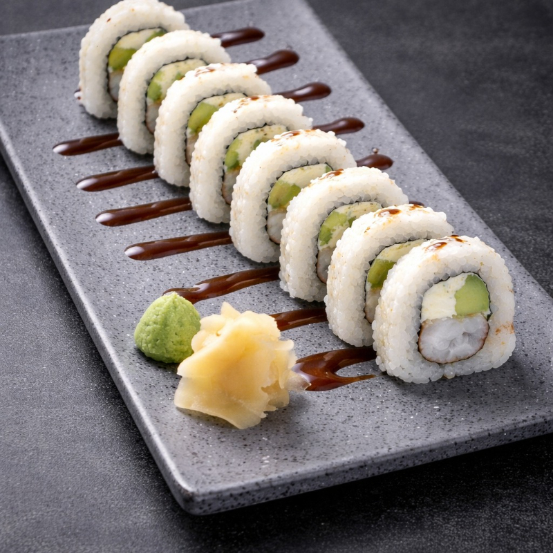 Philadelphia, Pepino, Cangrejo, Aguacate, Coronado con tampico, Ajonjoli y Anguila