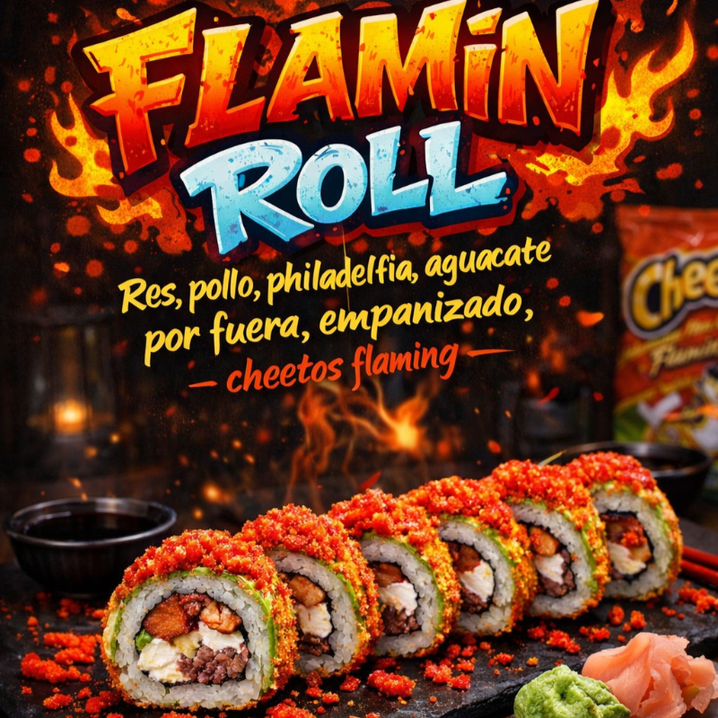 Res, Pollo, Philadelphia, Aguacate por fuera empanizado con Chetos Flamin