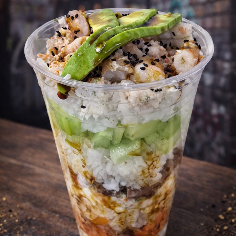 Sushi en Vaso con arroz, Pepino, Res, Pollo, Camarón, Aguacate