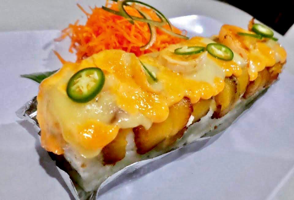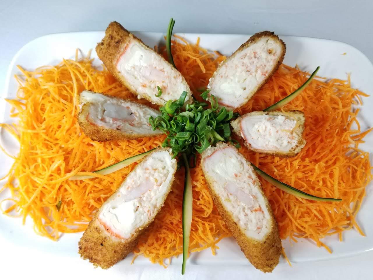 Camarón empanizado, aguacate, pepino y fila por dentro, cubierto con platano macho, camarón , chihuahua, bañado de aderezo y salsa de tamarindo.