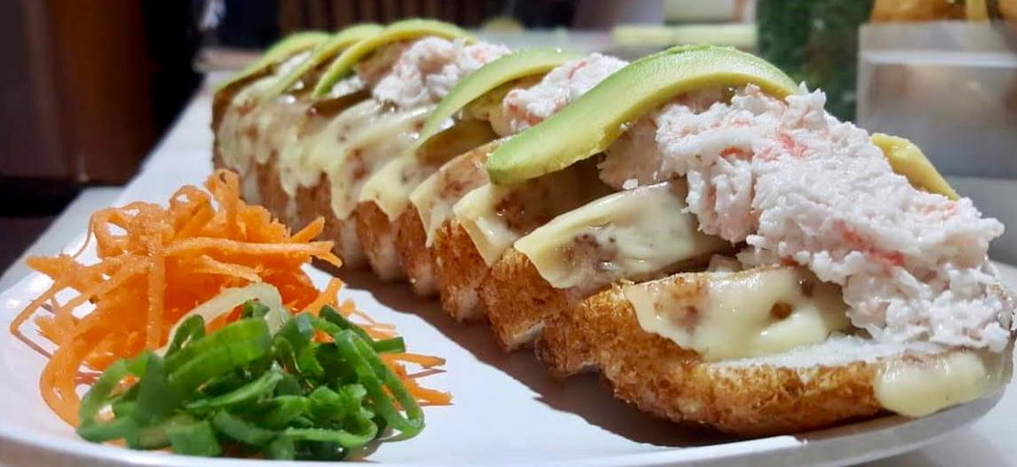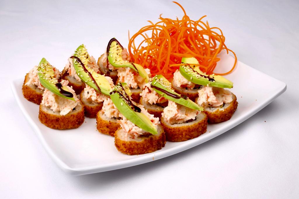Cangrejo, aguacate pepino y fila por dentro, cubierto de aguacate coronado con tampico y camarón empanizado, con un toque de salsa de anguila y sirracha.