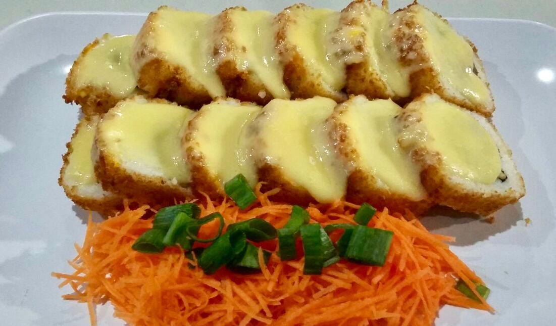Camarón empanizado, aguacate, pepino fila por dentro, cubierto de plátano macho, con un toque de salsa de tamarindo y ajonjolí.