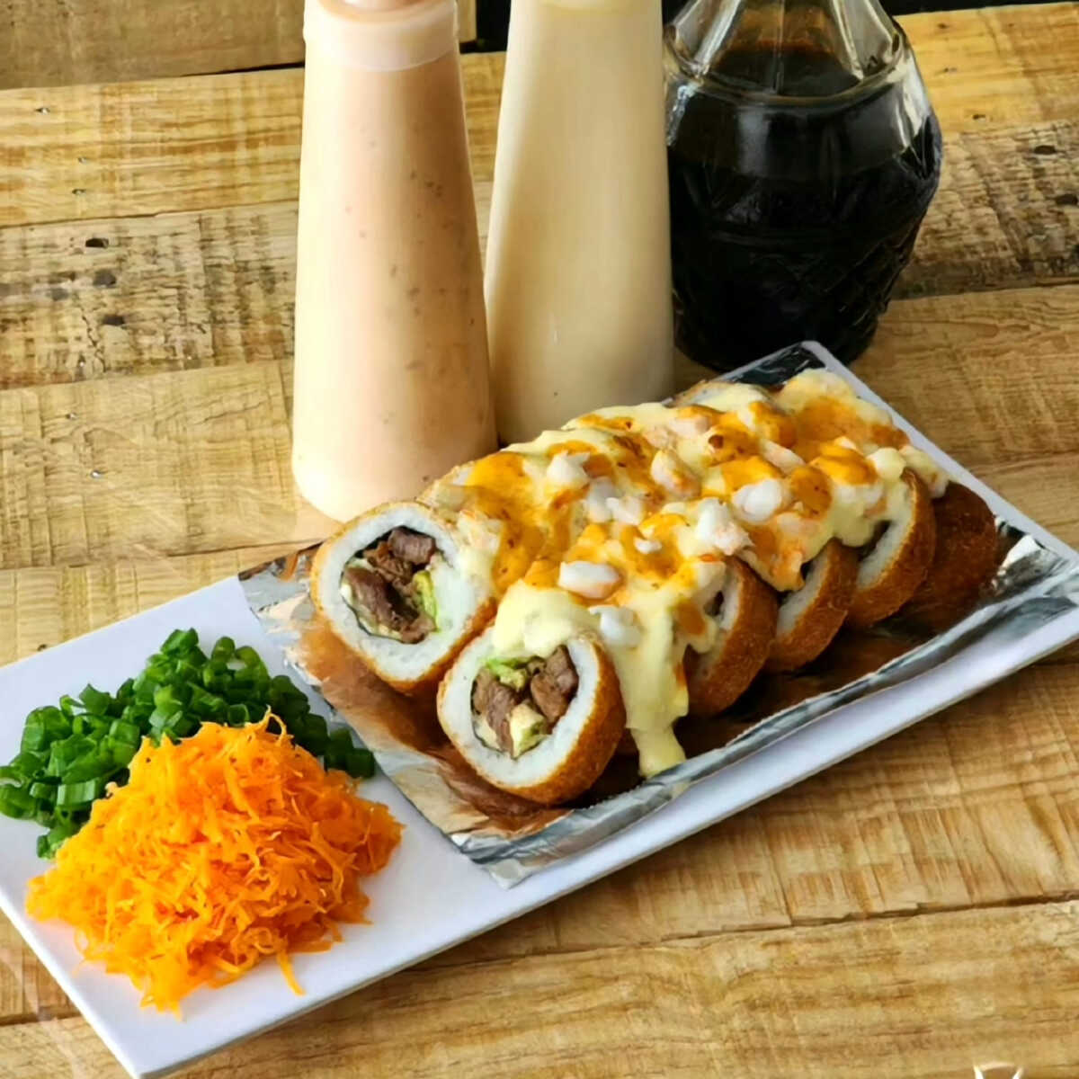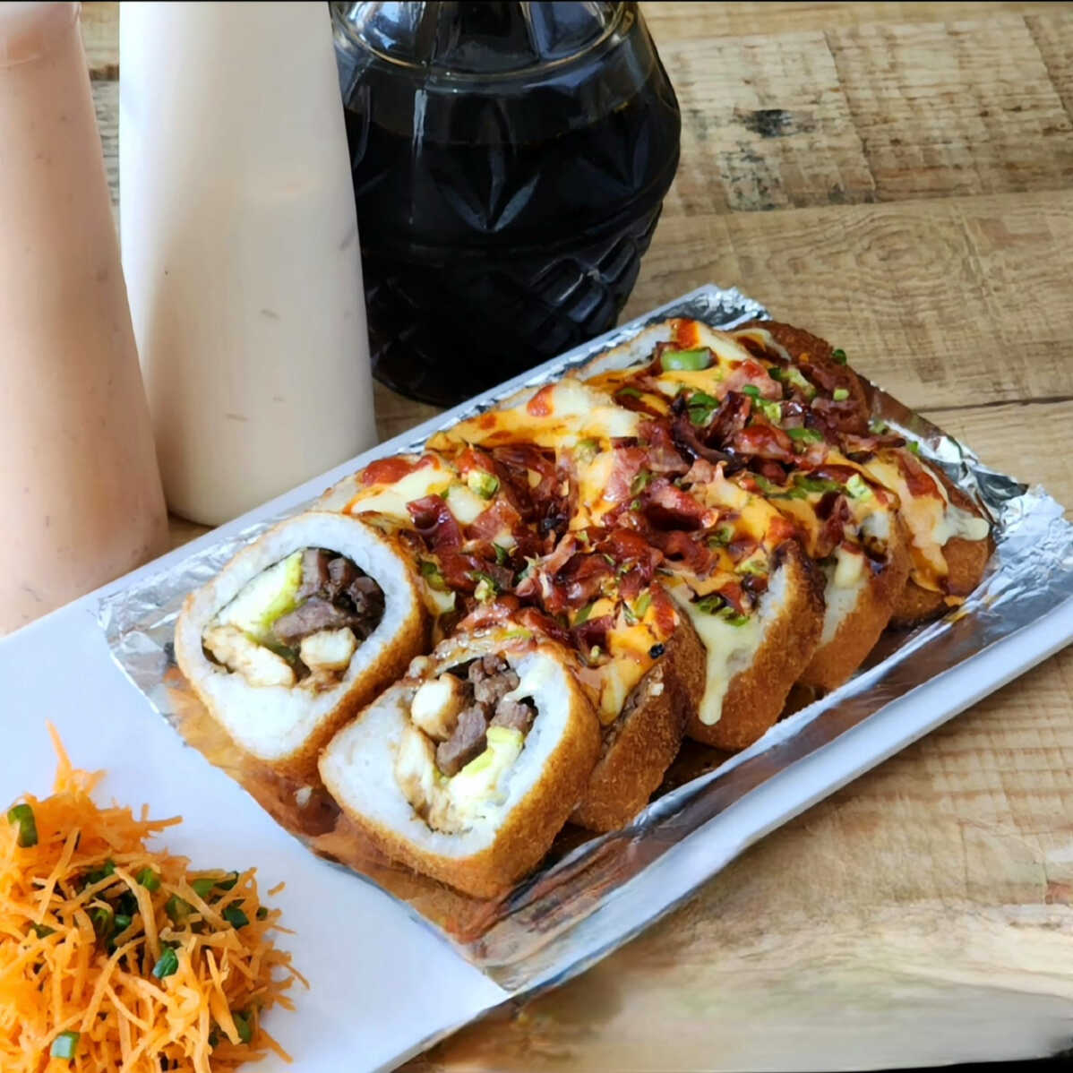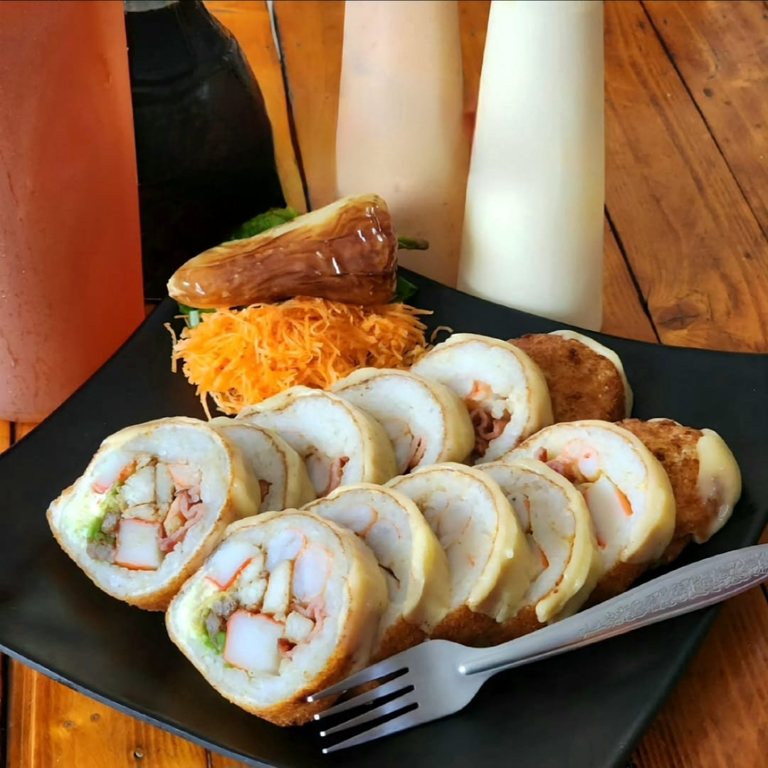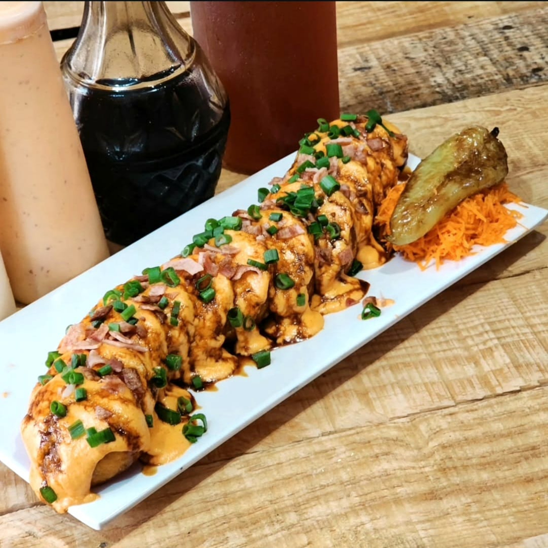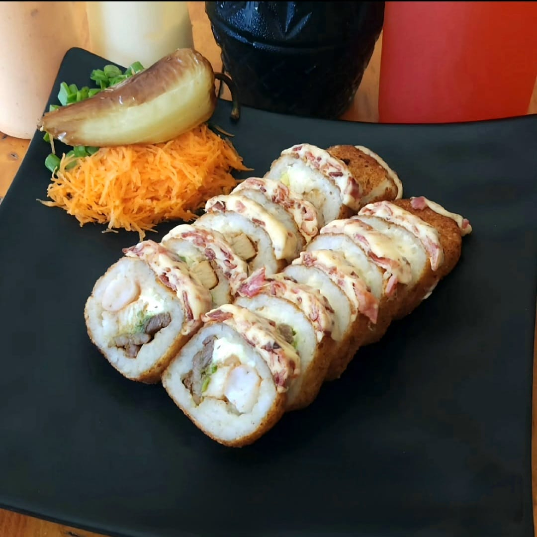 BOMBA: relleno de res, pollo, camaron, tampico y philadelphia. PF: empanizado con topping de queso chihuahua.