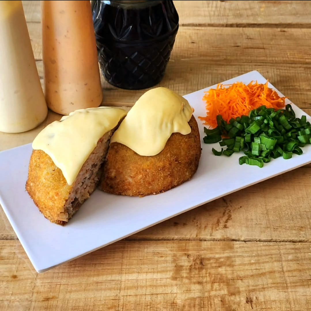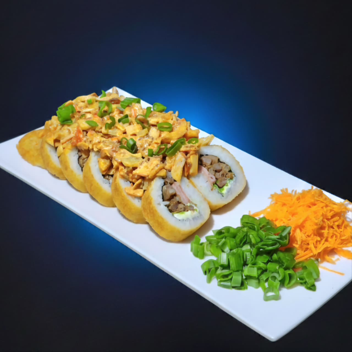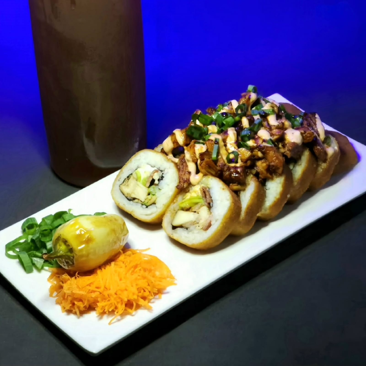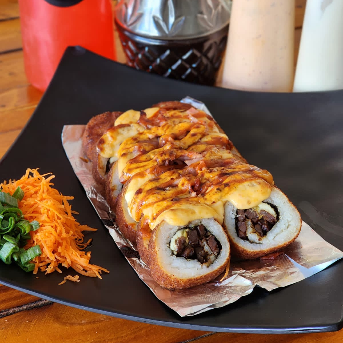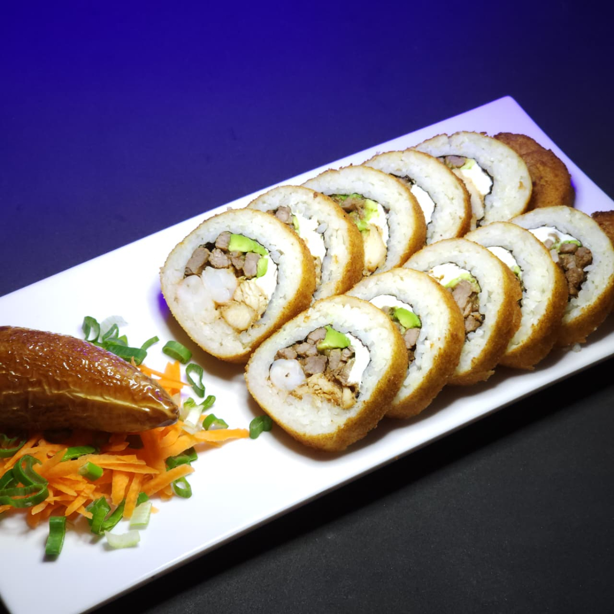 BOMBA: relleno de res, pollo, camaron, tampico y philadelphia. PF: empanizado con topping de queso chihuahua.