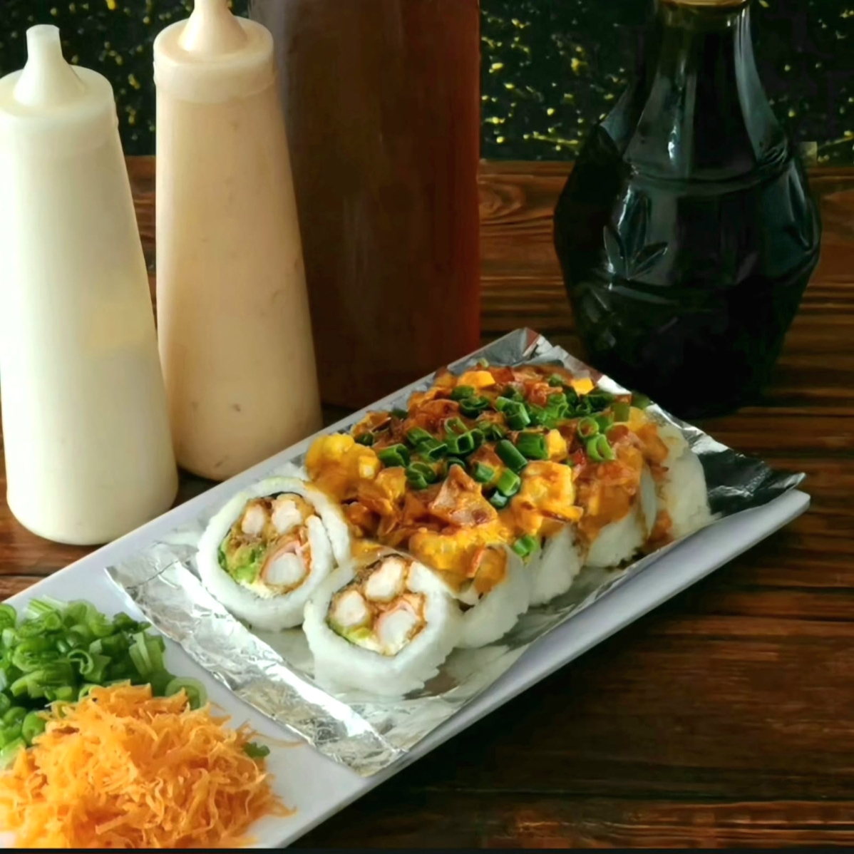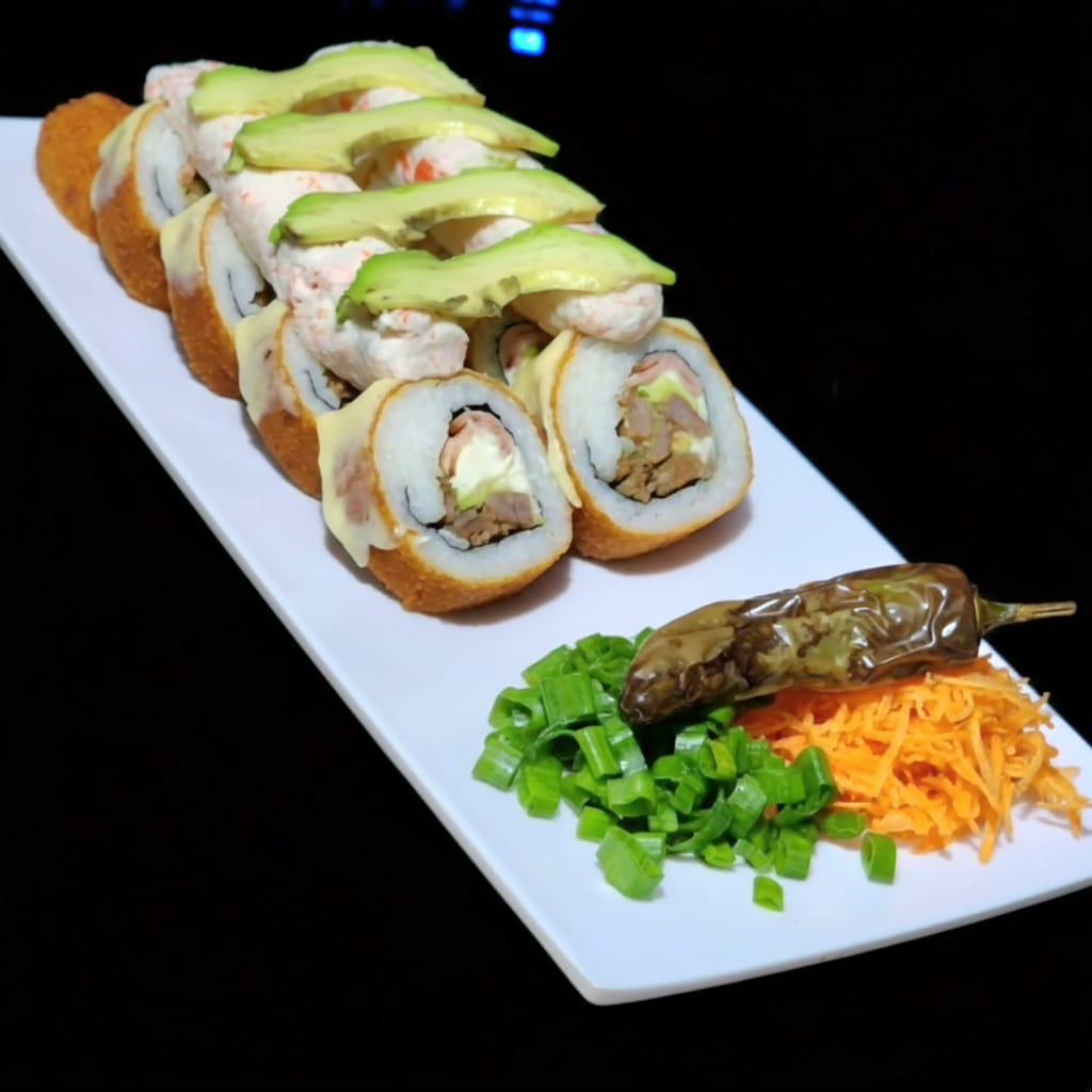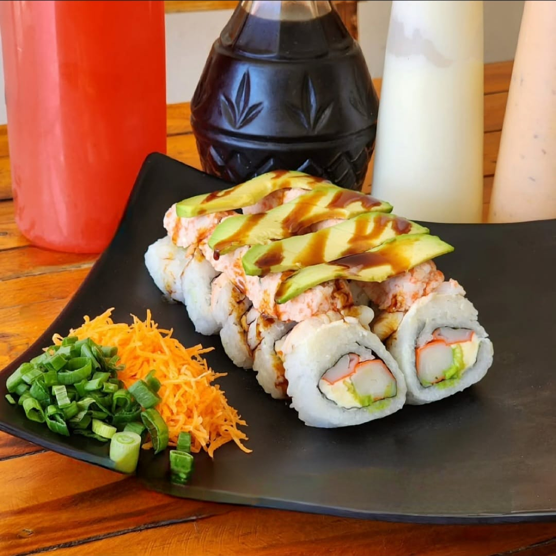 PD: philadelphia, aguacate, res, tocino y chile caribe. PF: topping de cangrejo picosito.