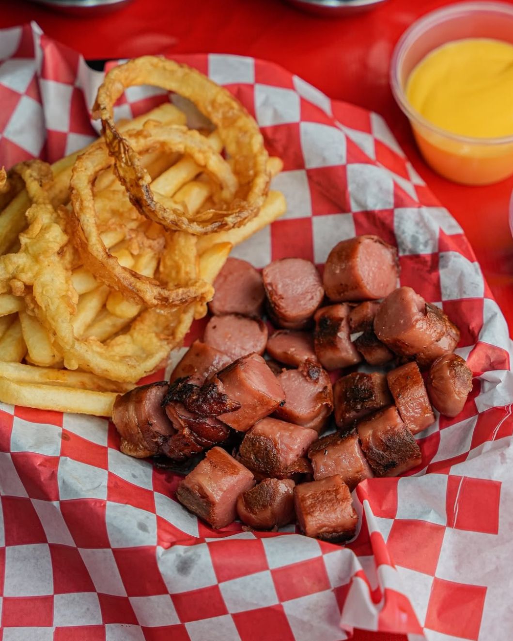 Res, tocino, queso y salchicha, incluyen papas y aros de cebolla.