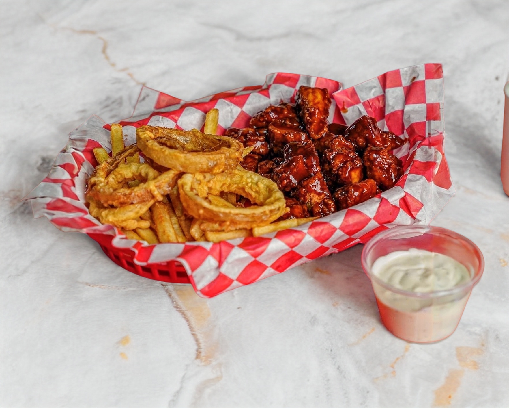 Triple res, camarón, pollo, incluyen papas y aros de cebolla.