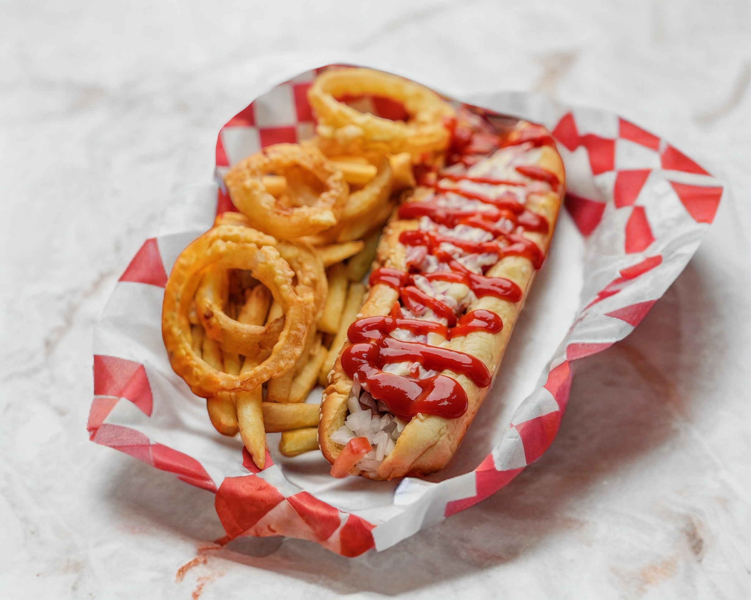 Acompañada de papas y aros de cebolla.
