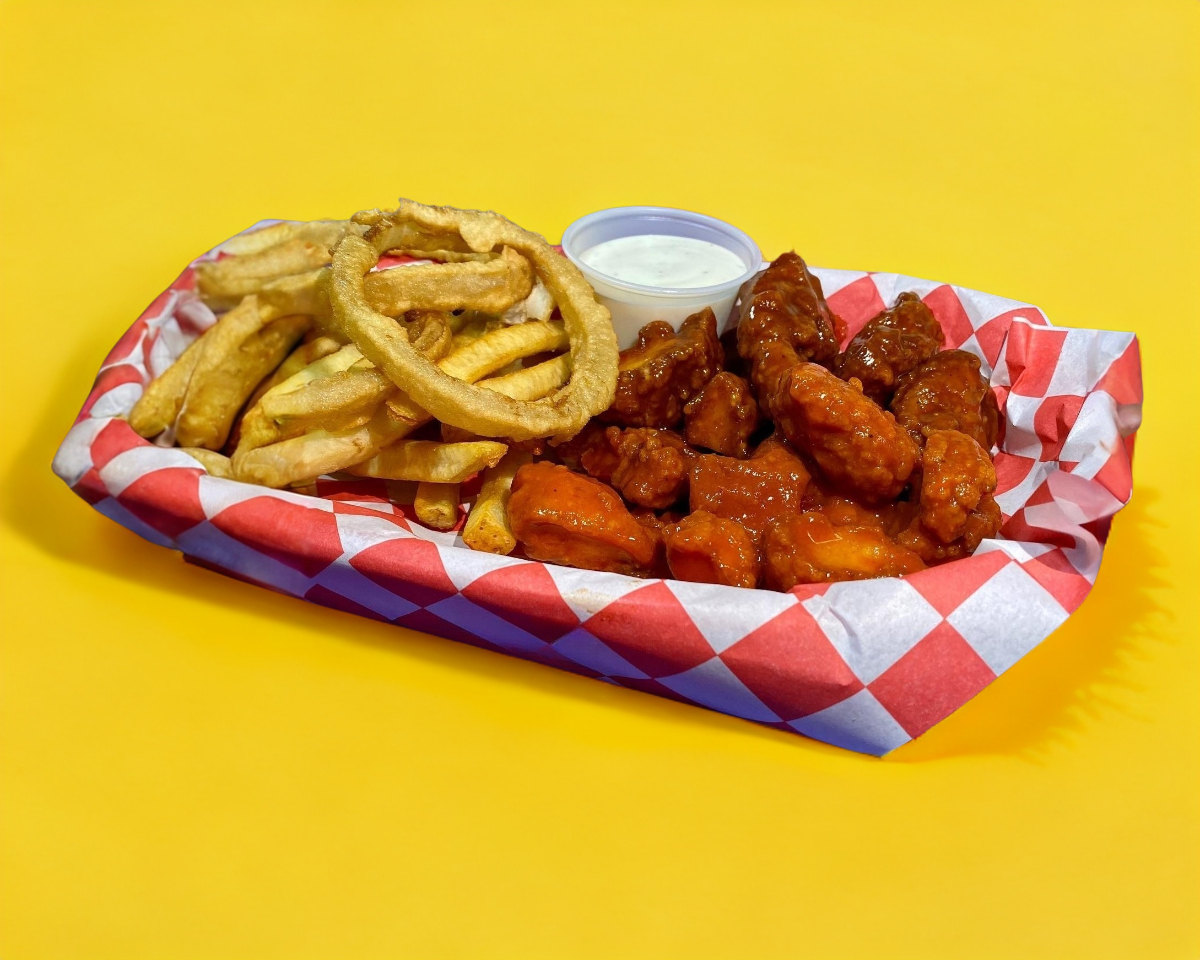 Orden de boneless acompañados con papas y aros de cebolla.