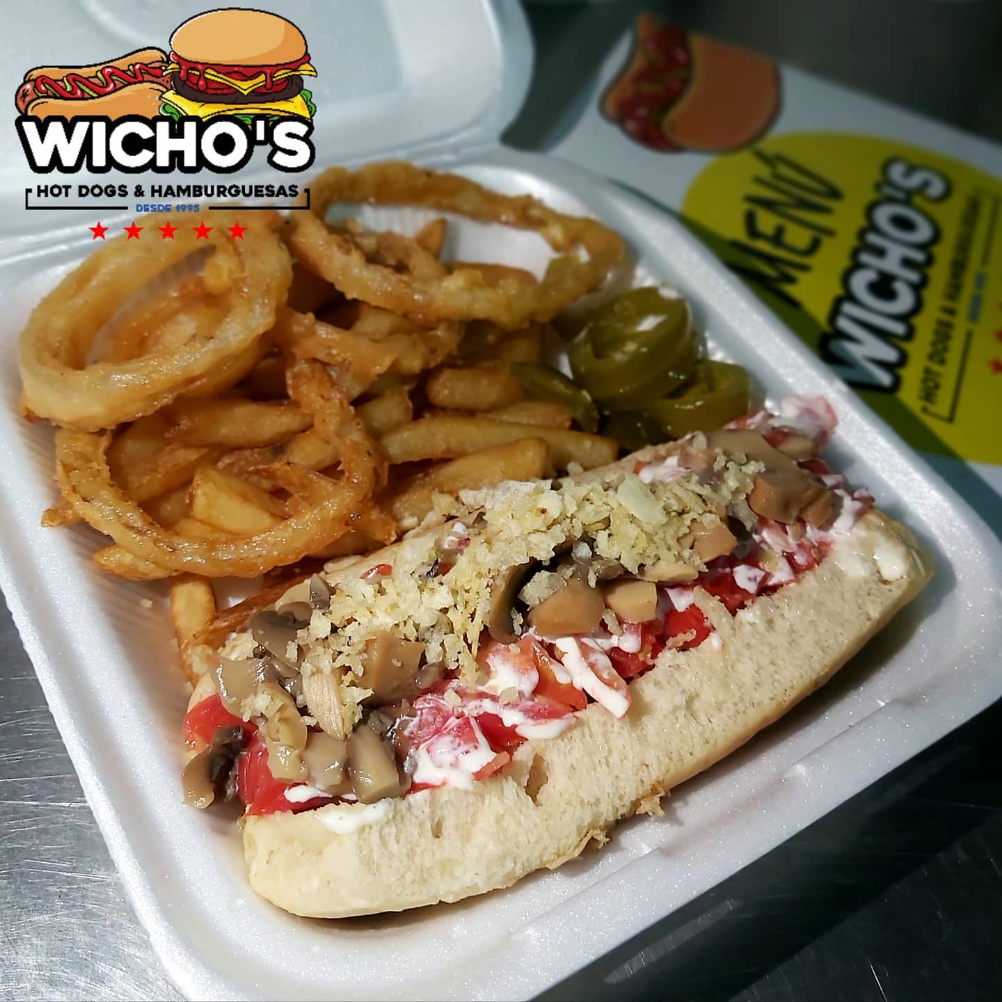 clasico de salchicha de pavo con tocino acompañado con papas y aros de cebolla.
