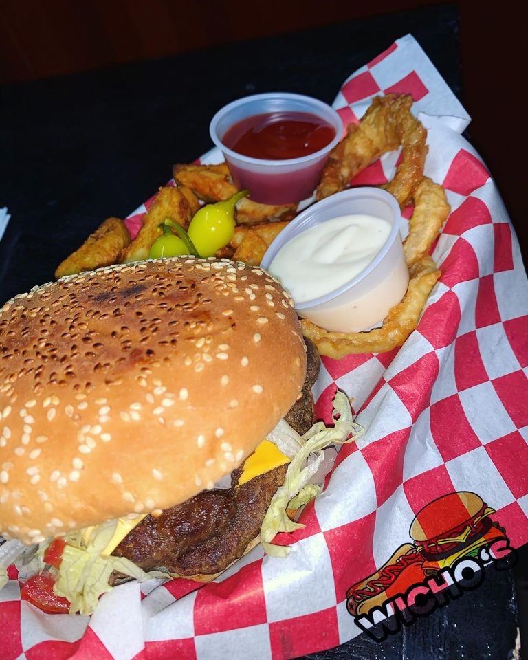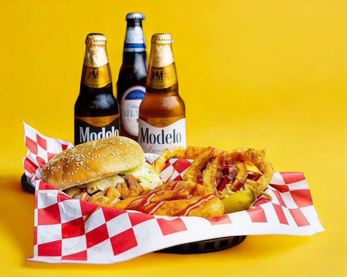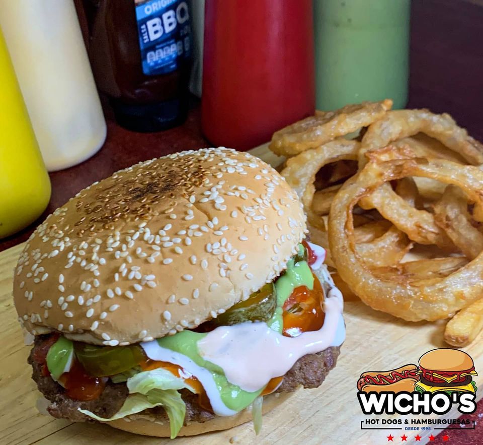 Clasica hamburguesa de carne de res acompañada con papas y aros de cebolla.