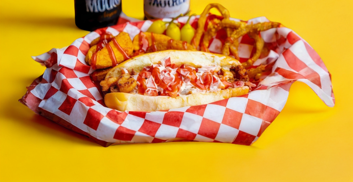 Hot dog de medallon de pollo partido en tiras acompañado de papas y aros de cebolla.