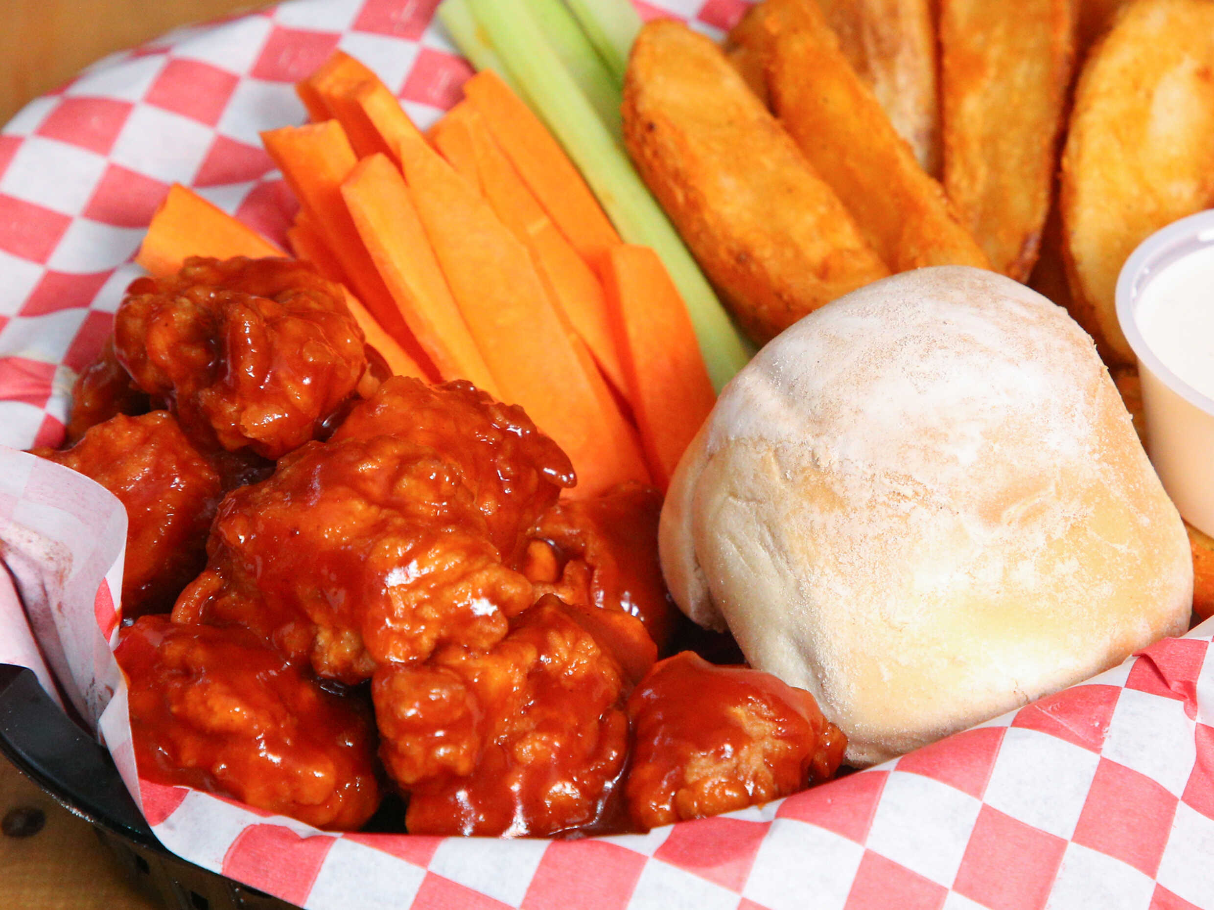 Crujiente Orden de boneless, deliciosa orden de alitas y acompañadas de papás gajo coronadas