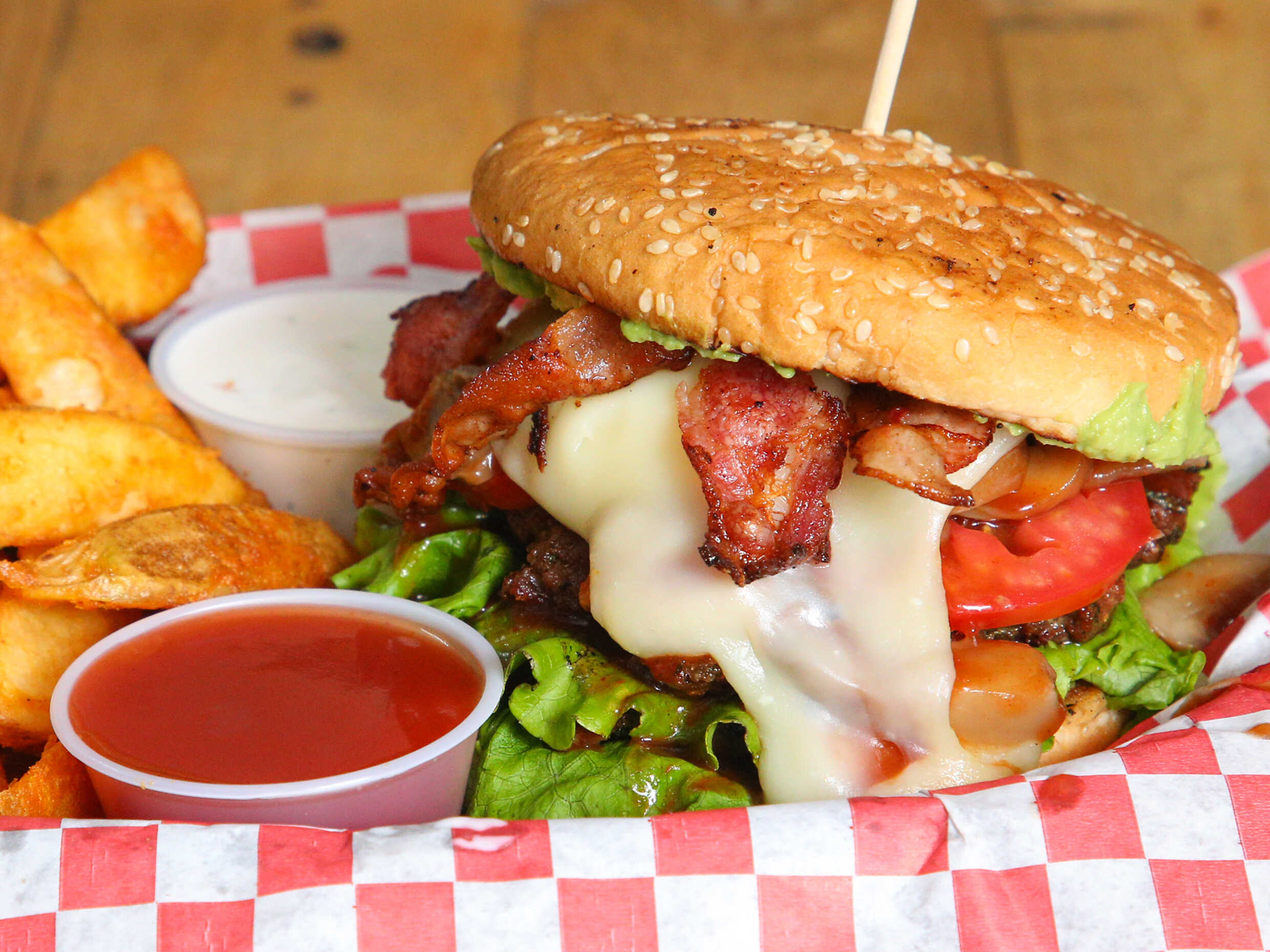 La combinación perfecta carne de res coronada con guacamole y champiñones, lechuga , tomate, cebolla asada y mayonesa, acompañada de papas gajo, aderezo ranch y cátsup.