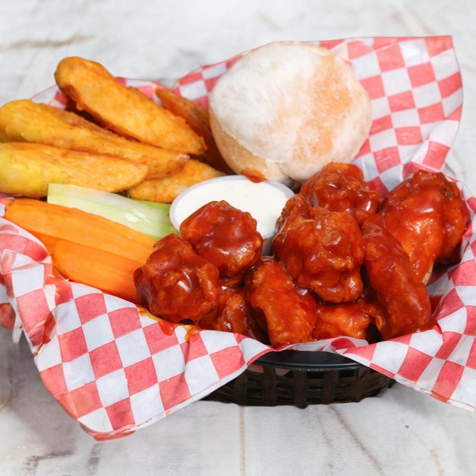 10 pzas. de boneless bañados en salsa a elegir (orden grande), vegetales , aderezo ranch y cátsup, no incluye papás.