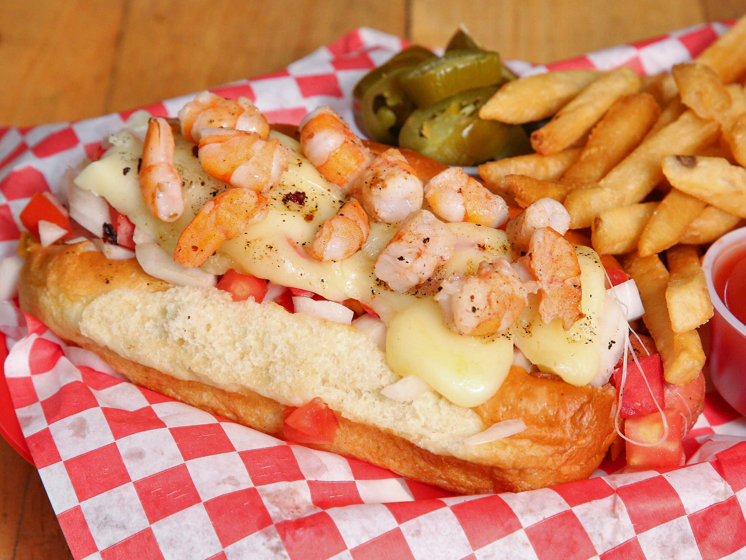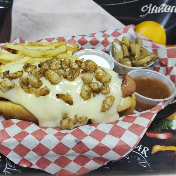 Topping de camarón a la plancha, gratinado, salchicha jumbo, pan, tomate, cebolla, mayonesa, acompañado de papas francesas, cátsup y chiles jalapeños.