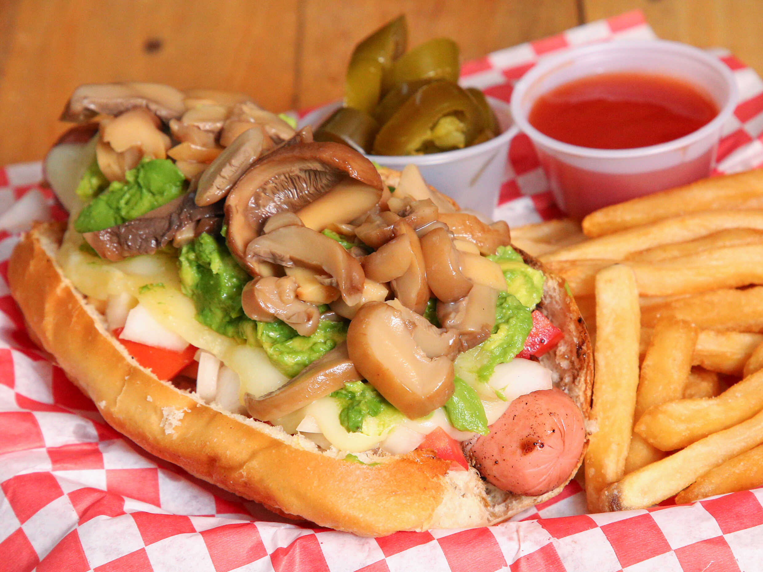 Topping de guacamole con champiñones, gratinado, salchicha jumbo, pan , tomate , cebolla , mayonesa , acompañado de papas francesas, cátsup y chiles jalapeños.