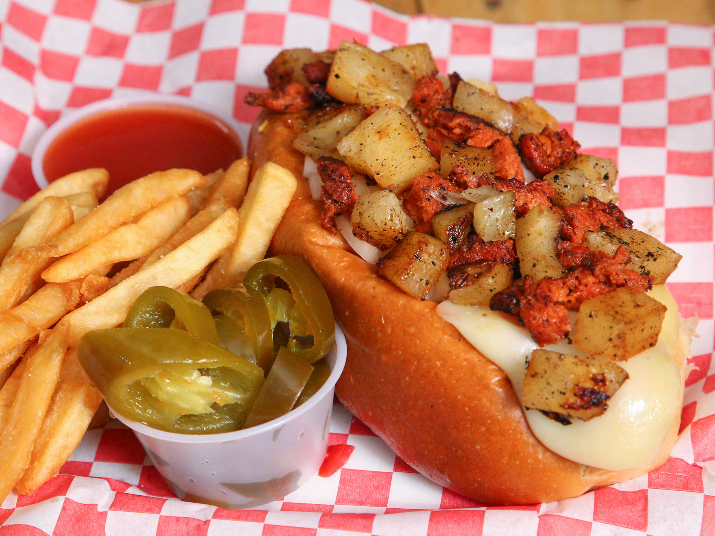 Topping de pastor con piña, gratinado, salchicha jumbo, pan, tomate, cebolla, mayonesa, acompañado de papas francesas, cátsup y chiles jalapeños.