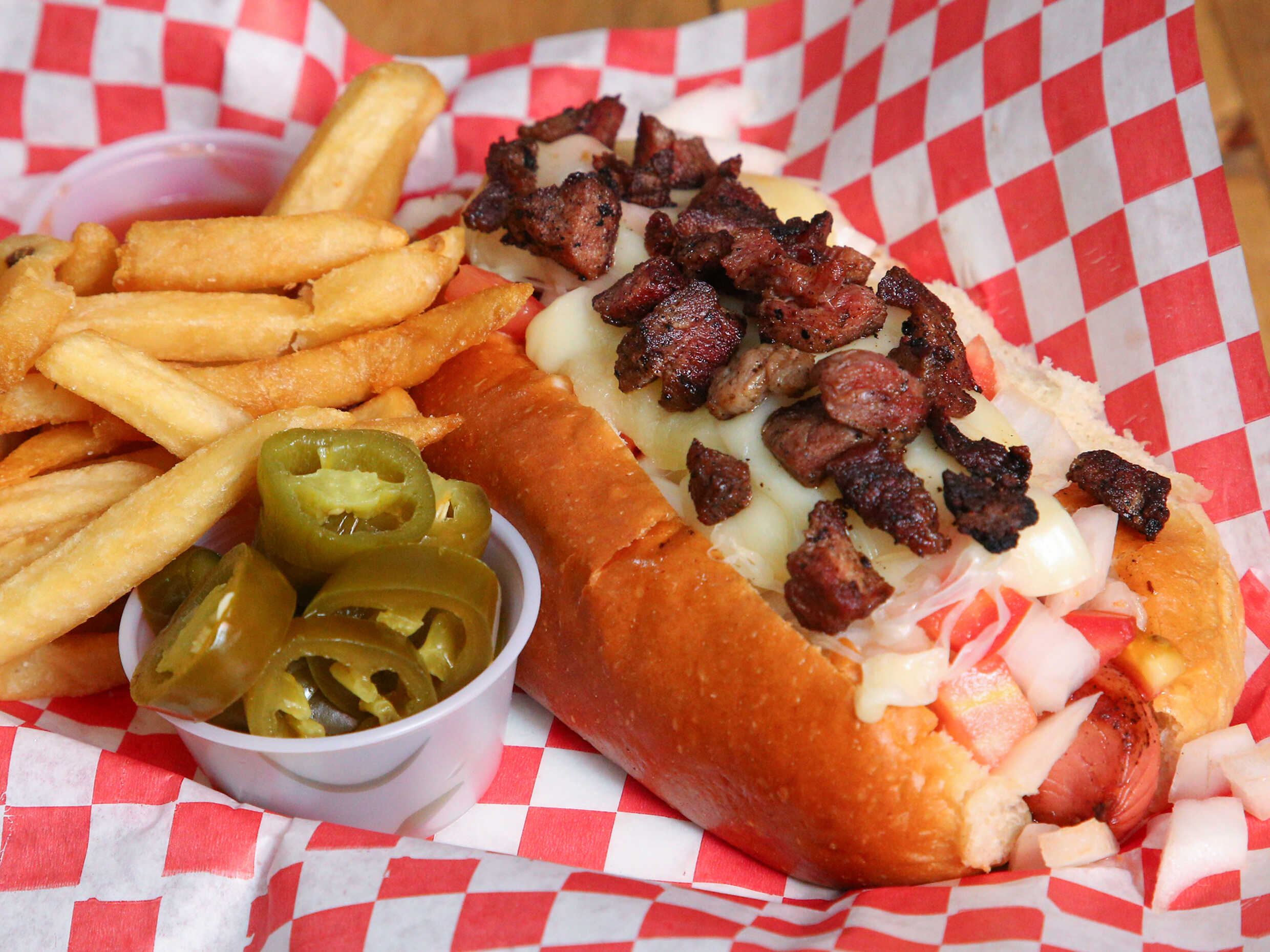 Topping de tocino, gratinado, salchicha jumbo, pan, tomate, cebolla , mayonesa , acompañado de papas francesas cátsup y chiles jalapeños.
