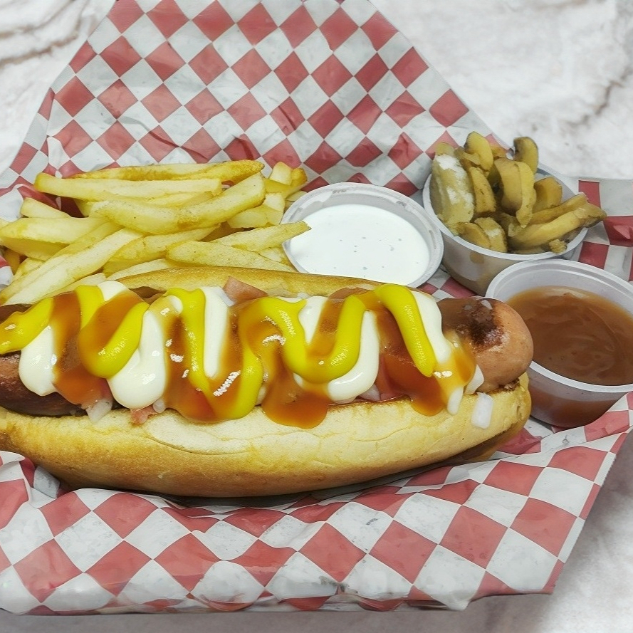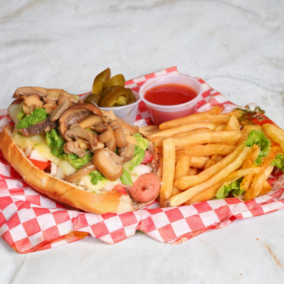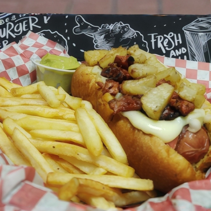 Topping a elegir, gratinado, salchicha jumbo, pan artesanal, tomate , cebolla , mayonesa, acompañado de papas francesas cátsup y chiles jalapeños.