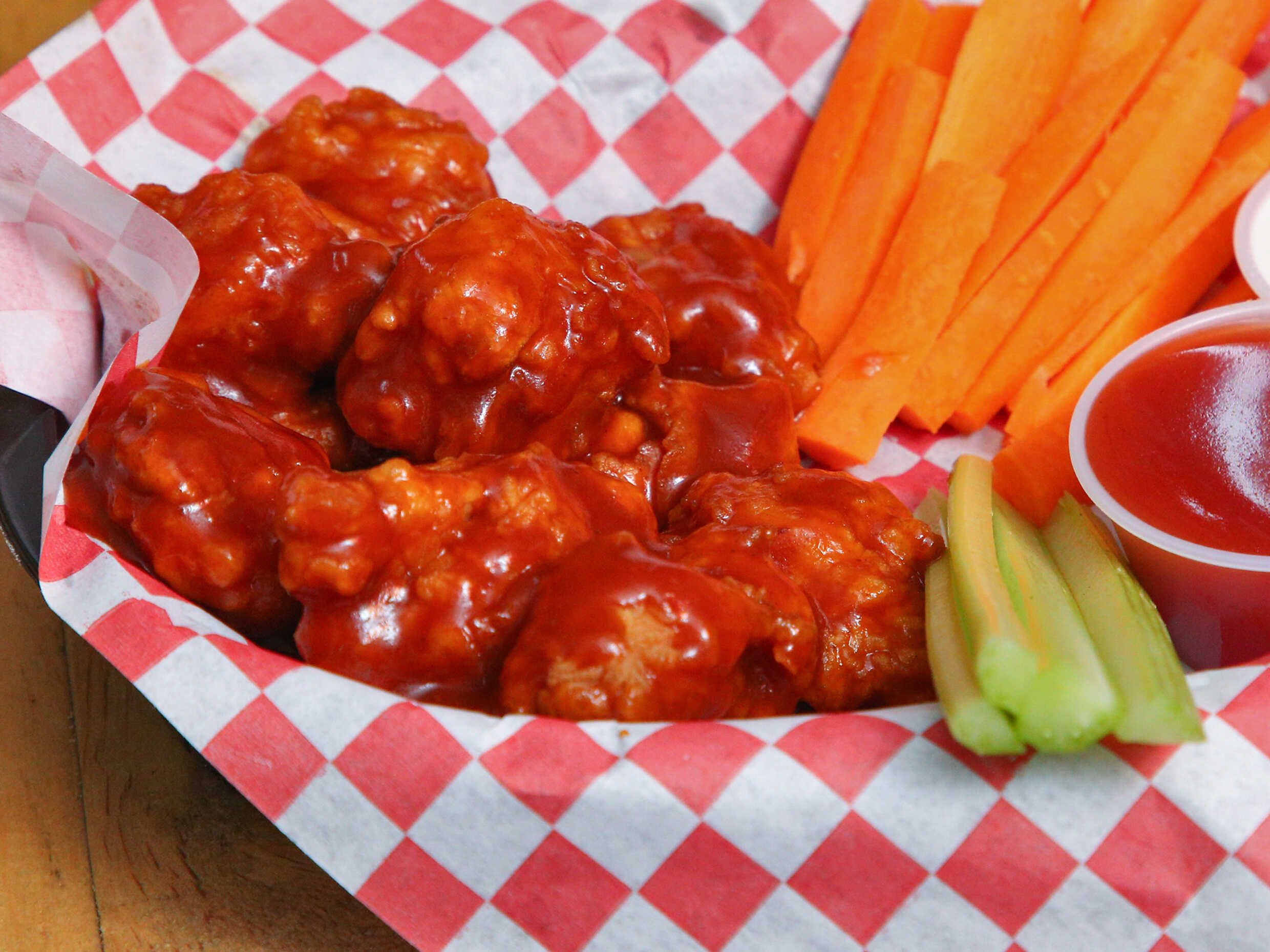 (40 pzas.) 1 kg. de boneless bañados en salsa a elegir acompañado de aderezo ranch.