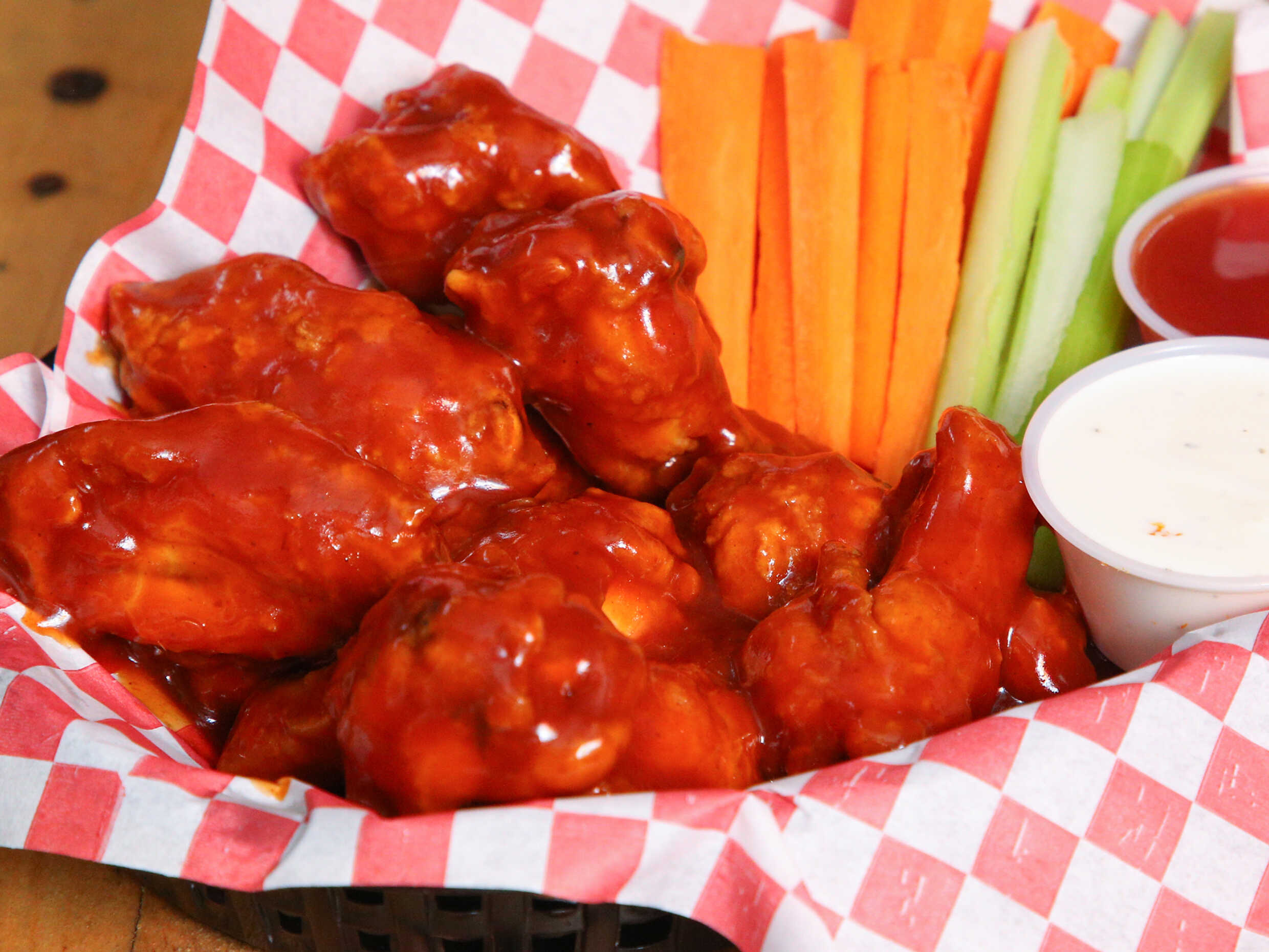 (16 alitas) 1/2 kg. de crujientes listas mañanas en salsa a elegir acompañado de aderezo ranch y vegetales.