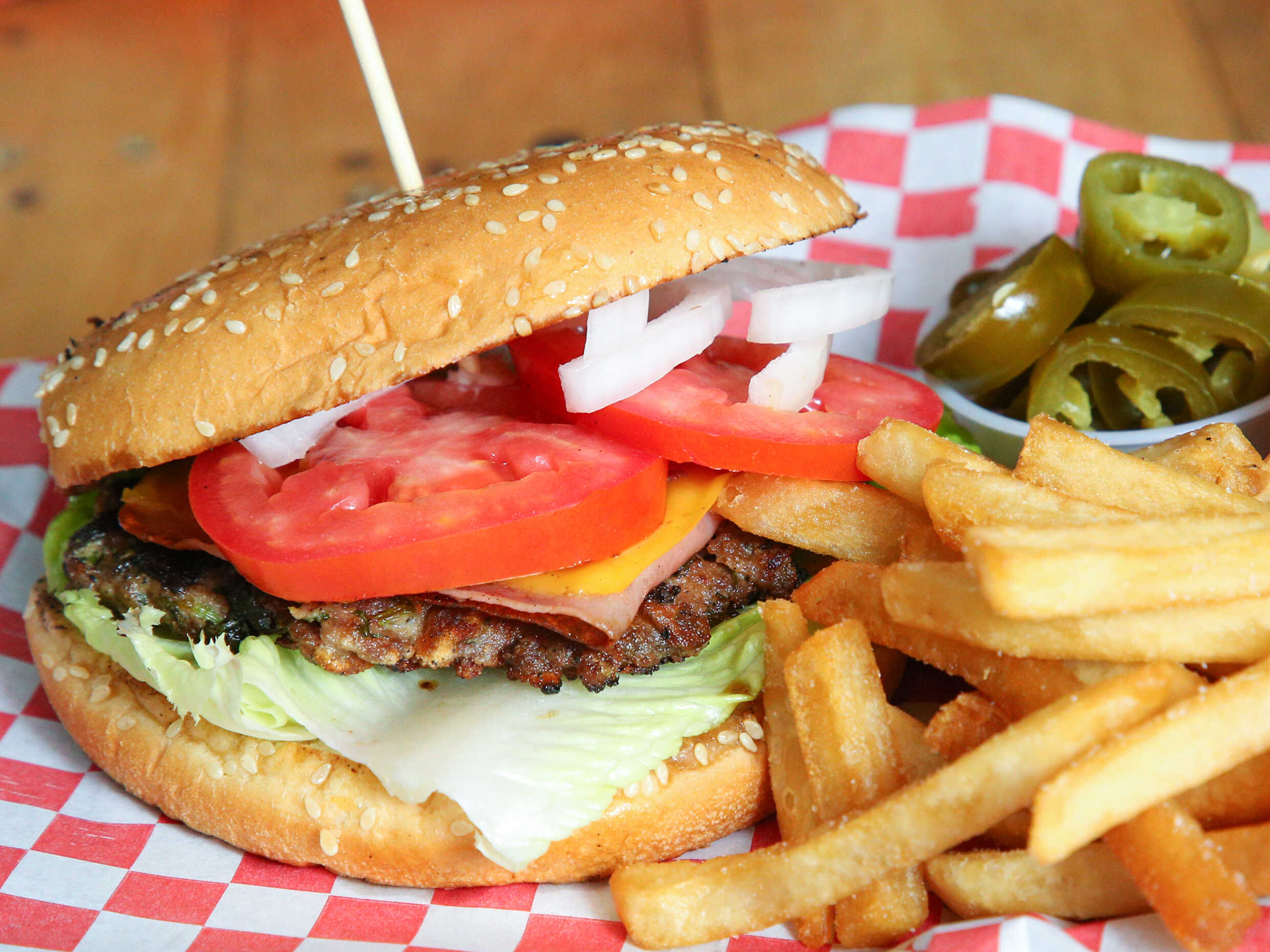 Hamburguesa de res, lechuga, cebolla asada, tomate, mayonesa, acompañado de papas francesas , catsup y chiles jalapeños