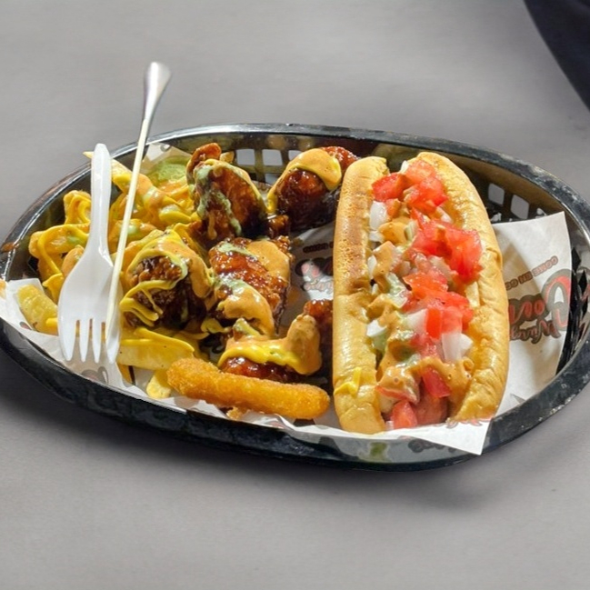 Salchicha envuelta en tocino, jamón, queso amarillo, tomate, cebolla. Aderezos a elegir. Incluye papas