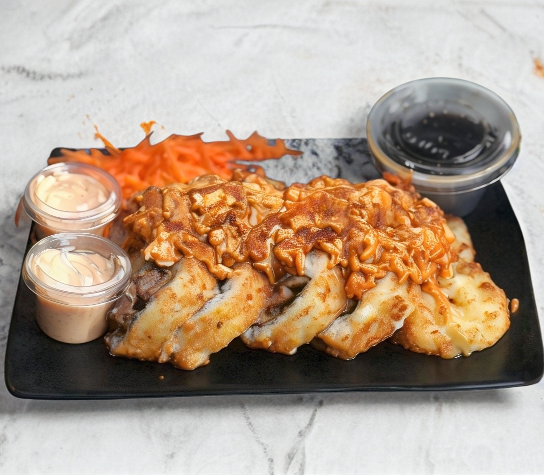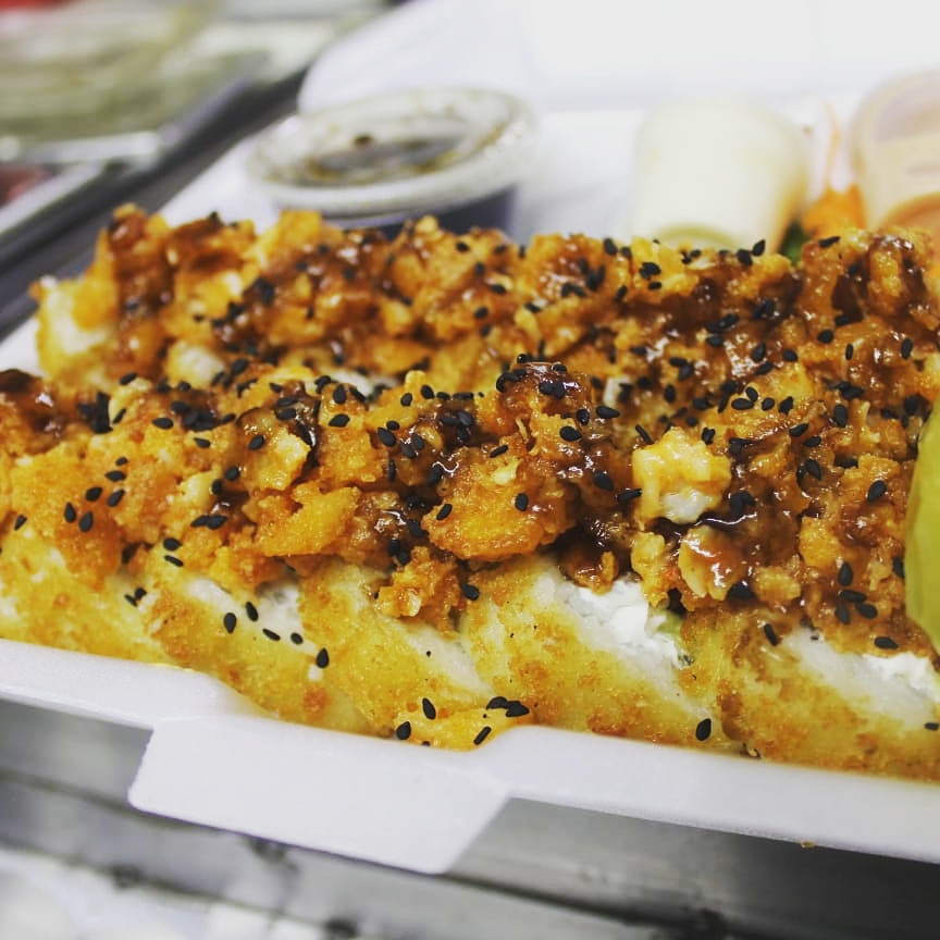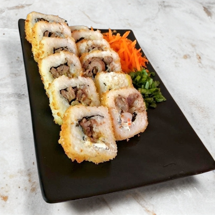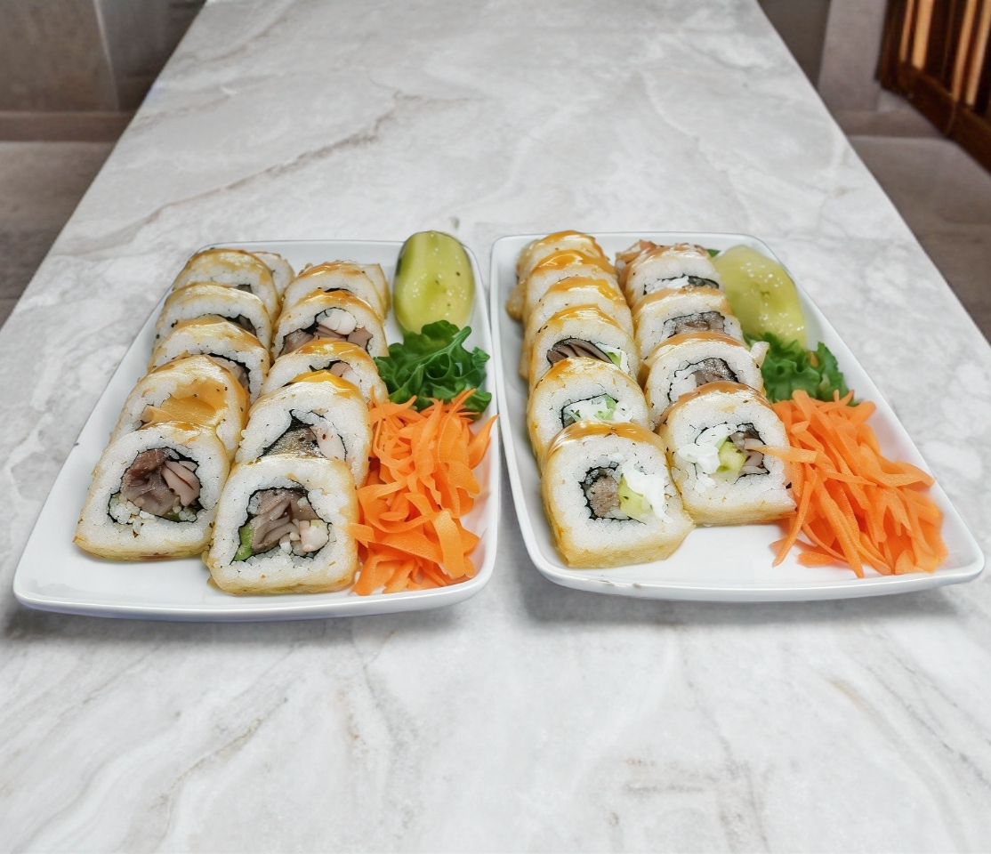 11 a 12 piezas, rollos cubiertos con pollo y tocino, rellenos de Philadelphia y aguacate, para una combinación irresistible.