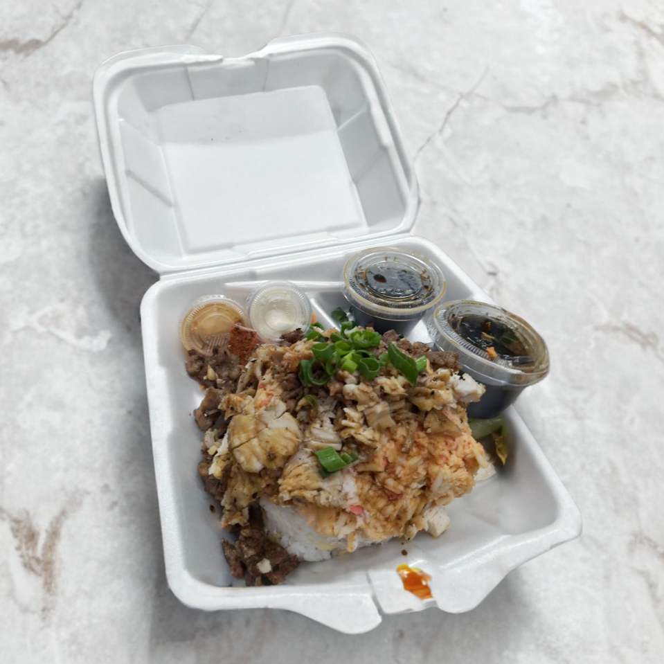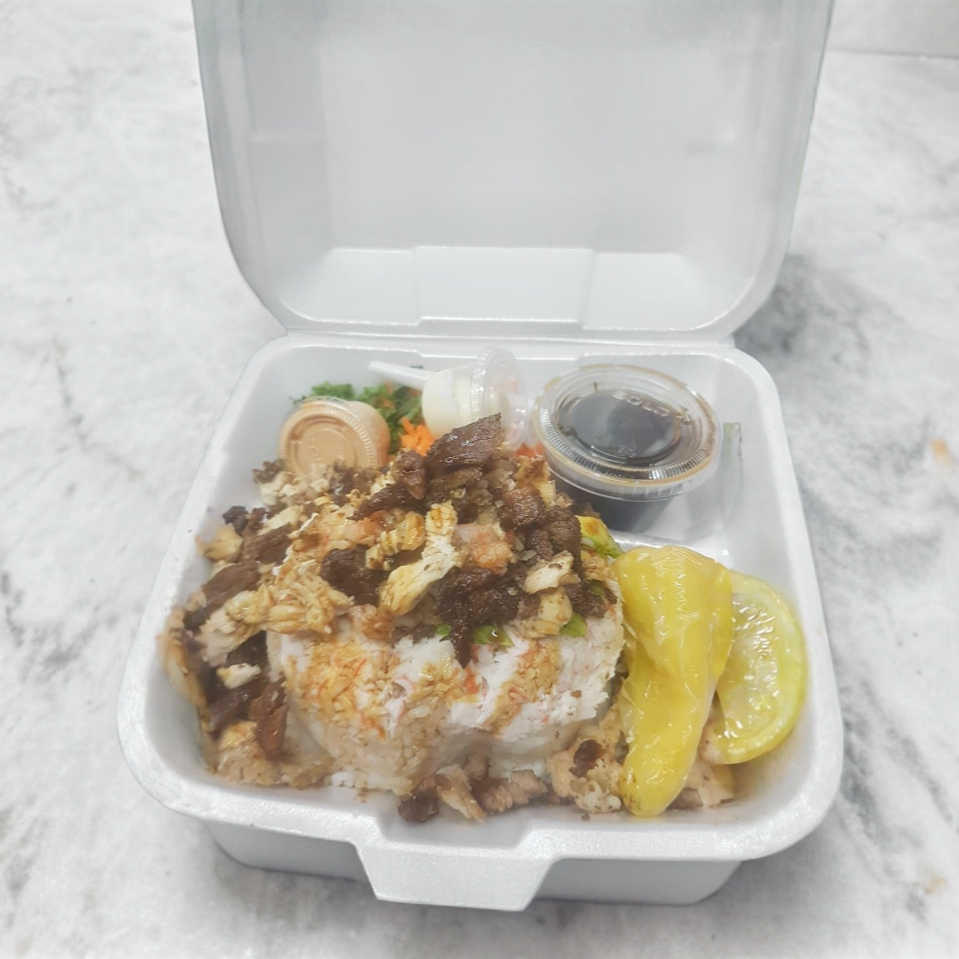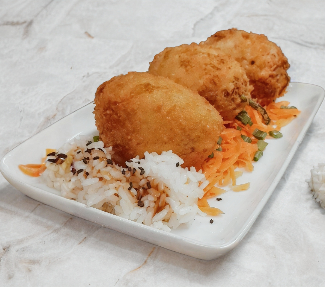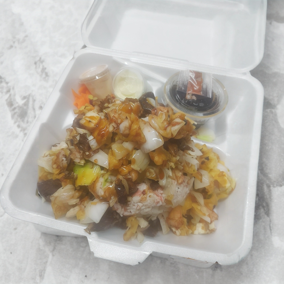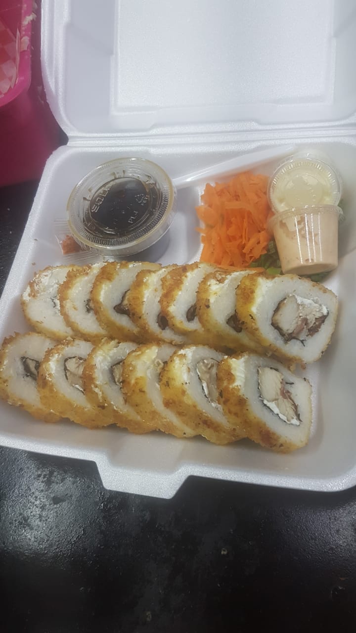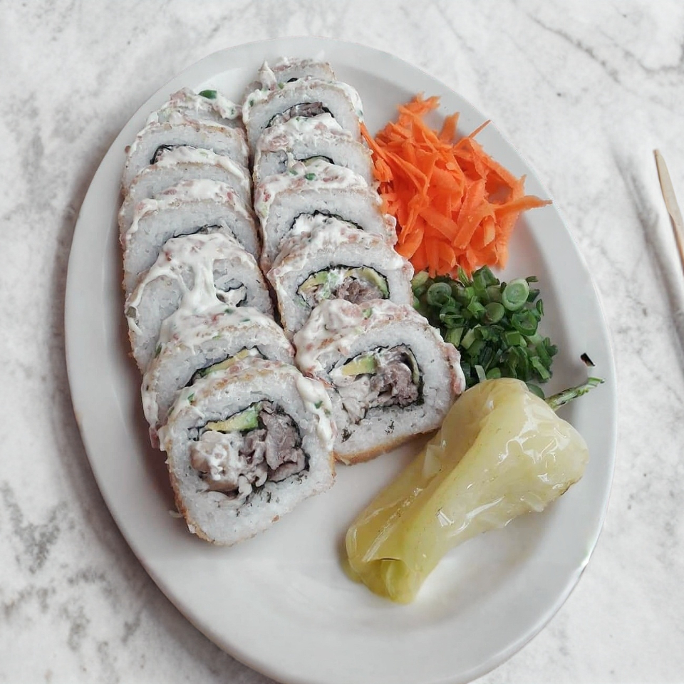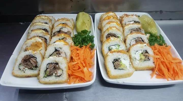 Arroz Blanco, philadelphia, aguacate, res, pollo, camaron y cebolla en tempura.