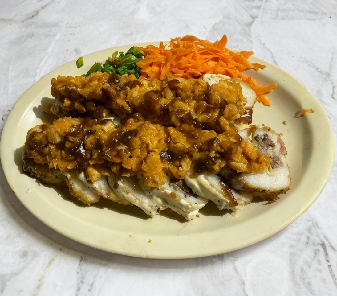 Por dentro philadlephia, aguacate res y pollo, por fuera topping gratinado tocino y serrano.