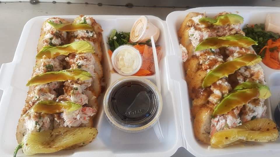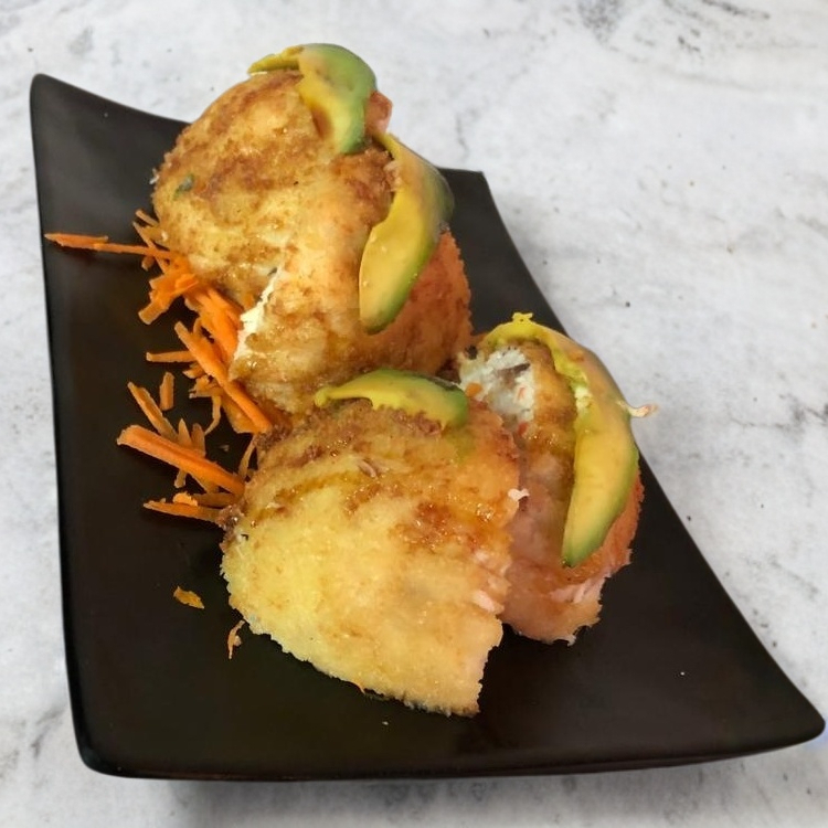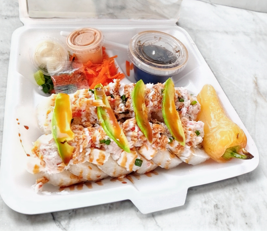 Por dentro aguacate, camaron empanizado, tocino, chile caribe por fuera y cangrejo con salsa siracha