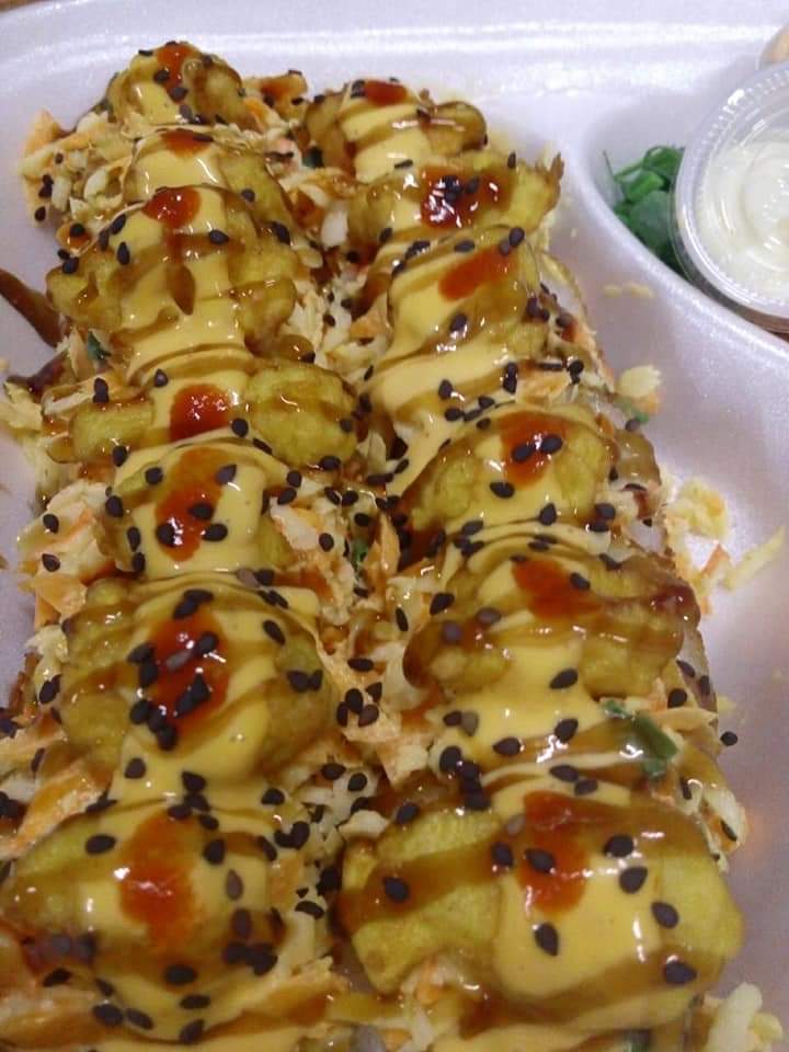 Relleno de cangrejo, por fuera Philadelphia coronado con tampico y salsa de anguila