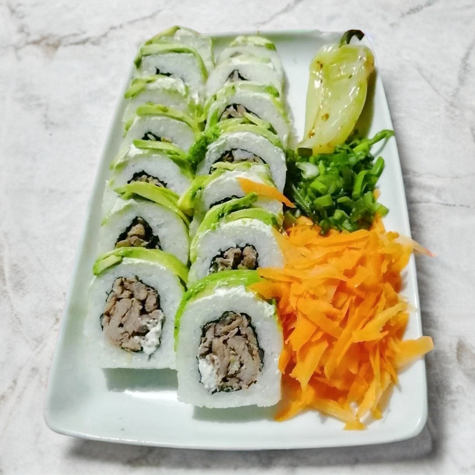 Por dentro philadelphia, aguacate y res forrado de aguacate.