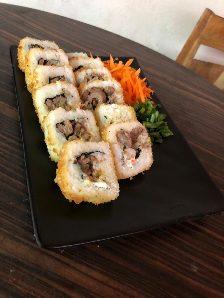 Por dentro philadelphia, aguacate y res. Por fuera topping de camaron empanizado, salsa de anguila