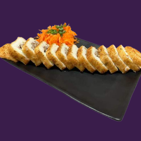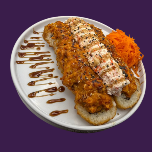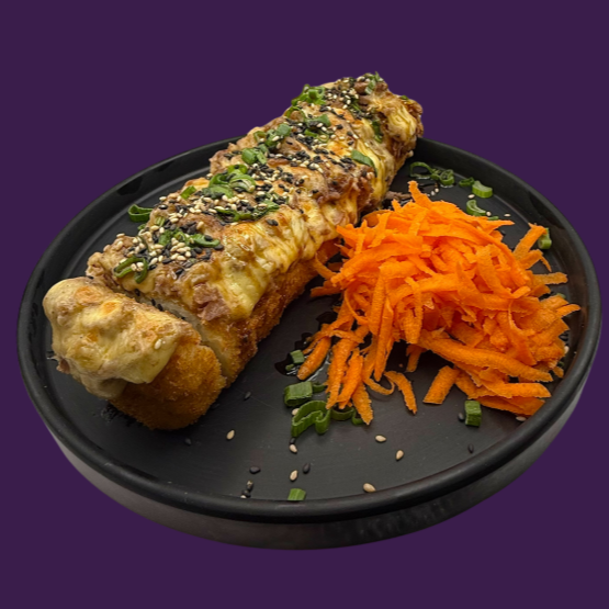 Por dentro, philadelphia, queso chihuahua, pollo y tocino. Por fuera: gratinado con aderezo y coronado con res y chile serrano. (empanizado).