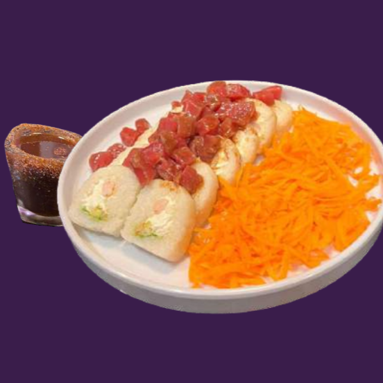 Por dentro philadelphia, aguacate, y camarón. Por fuera, atún y un shot de la casa (natural).