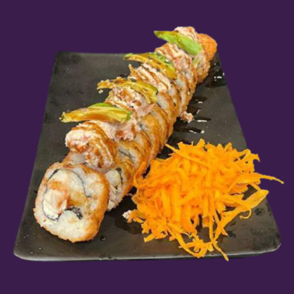 Por dentro: philadelphia, aguacate, surimi empanizado. Por fuera: gratinado con camaron picosito bañado en salsa de anguila).