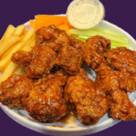 Orden de alitas (800 g), acompañado de papas a la francesa, con aderezo ranch al centro.