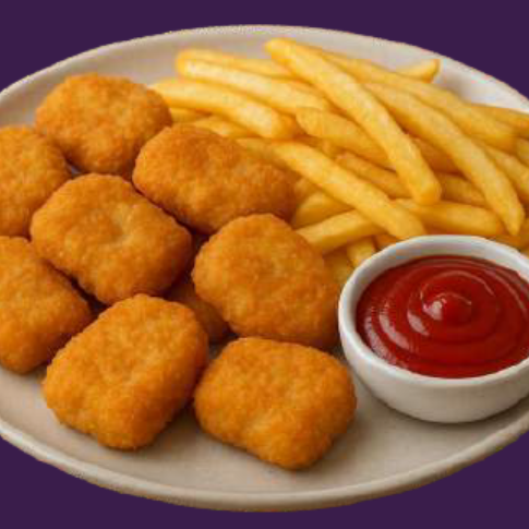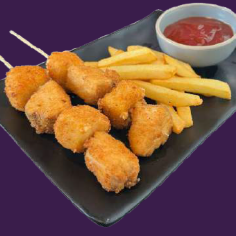 Brochetas empanizadas de pollo y queso (2 piezas), acompañadas con papas a la francesa.