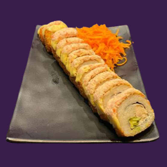Rollo gigantepor dentro, philadelphia, aguacate, camarón, pollo, res, surimi, tocino; gratinado con philadelphia, queso chihuahua y aderezo, coronado con boneless y camarón empanizado, bañado con salsa de anguila, (empanizado), (1.5 kg).