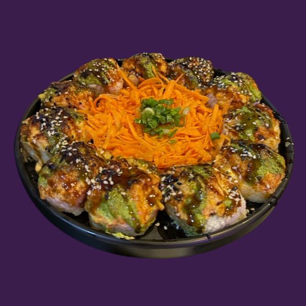 Por dentro: philadelphia, aguacate, camaron empanizado, salmon empanizado, chile caribe. Por fuera: gratinado spicy y pulpo.