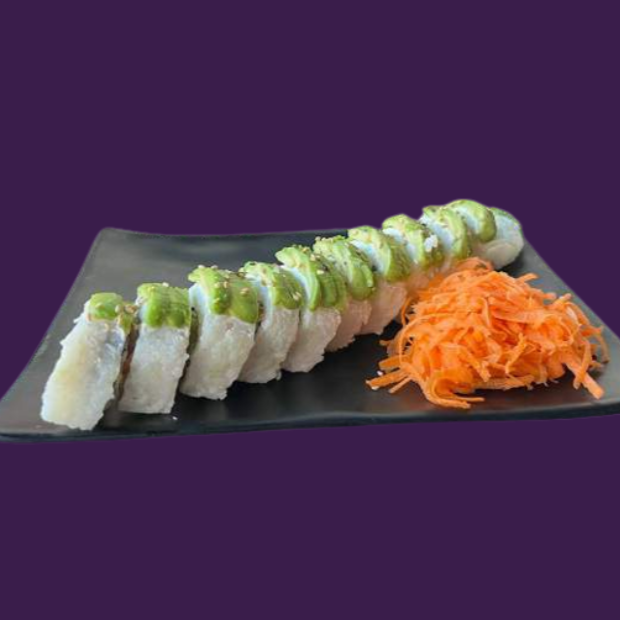 Por dentro: philadelphia, aguacate y camarón, por fuera aguacate, coronado con kanikama, camarón empanizado, philadelphia y puntos de cilantro bañado en salsa de anguila (natural).
