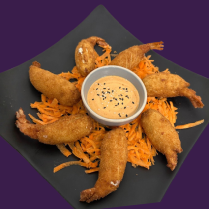 Camarones estilo tempura bañados con salsa especial y coronado con cebollín 150 g.