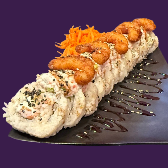 Por dentro: philadelphia, aguacate, surimi. Por fuera: coronado con gratinado de la casa, camarones empanizados y puntos de sriracha.