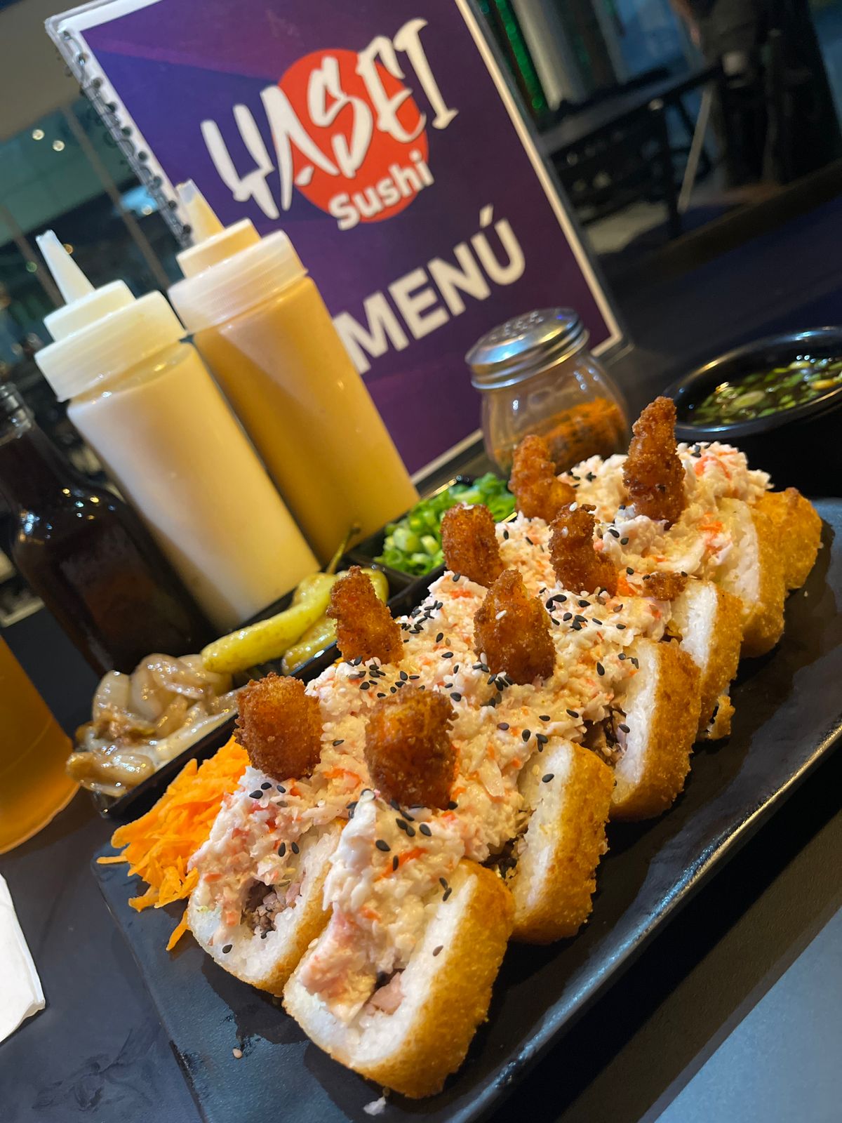 ARROZ PREPARADO DE LA CASA, PHILADELPHIA, CHILE CARIBE, RES Y POLLO, GRATINADA, BAÑADA EN ADEREZO, SALSA DE ANGUILA Y PUNTO DE SRIRACHA.