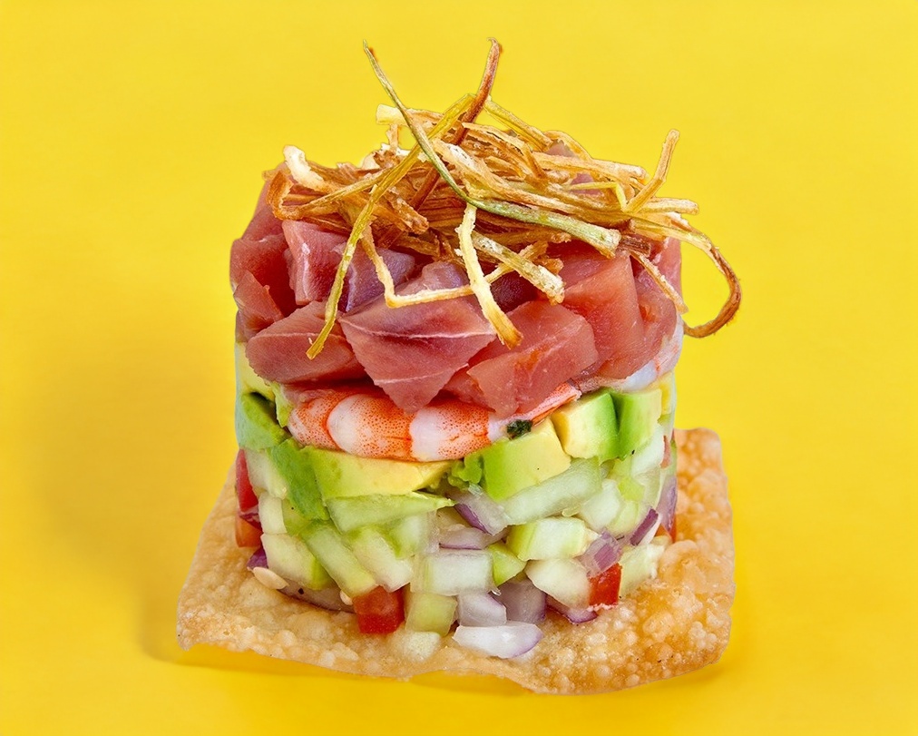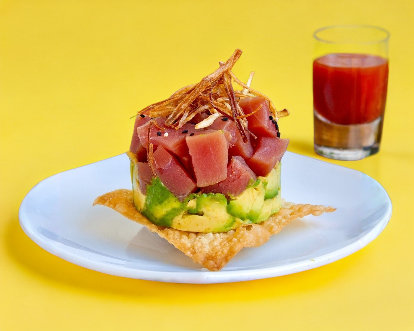 Exquisita tostada de atún, cubos de aguacate, poro frito y ajonjolí negro, con un shot de aguachile.
