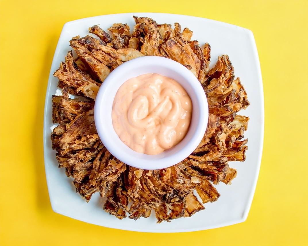 Cebolla empanizada en forma de flor con dip a elegir de BBQ, búfalo, ranch, habanero o rocka.