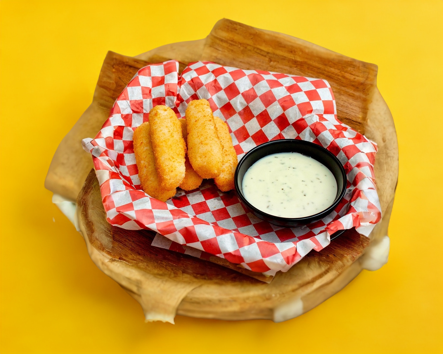 5 piezas de dedos de queso acompañados de una copita de arroz y aderezo ranch.