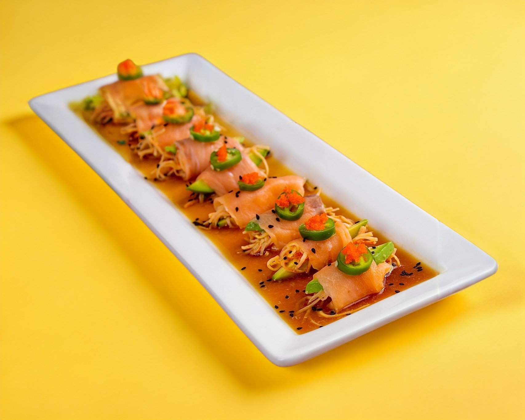 9 curricanes hechos de salmón, aguacate y kanikama, montaditos sobre nuestra salsa poke, coronados de serrano y massago para darles el toque final.